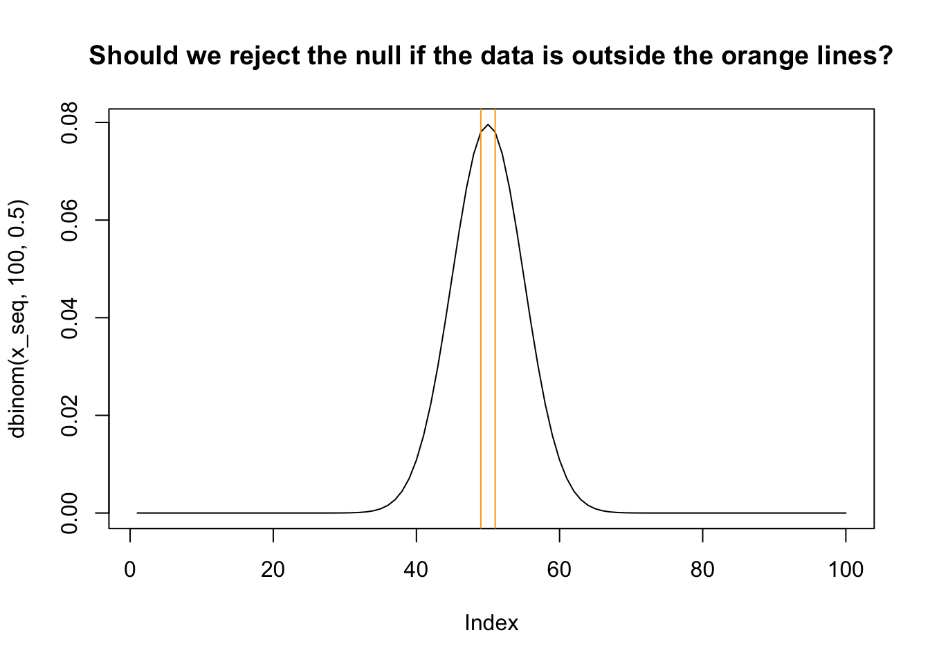title(main = "Should we reject the null if the data is outside the orange lines?")